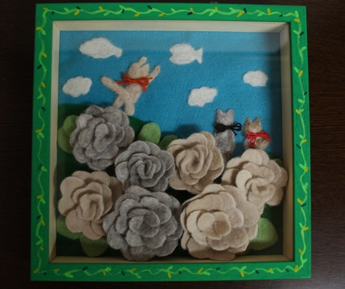 自身の毛でそれぞれの子、薔薇や雲なども猫毛・犬毛を使って描きました。