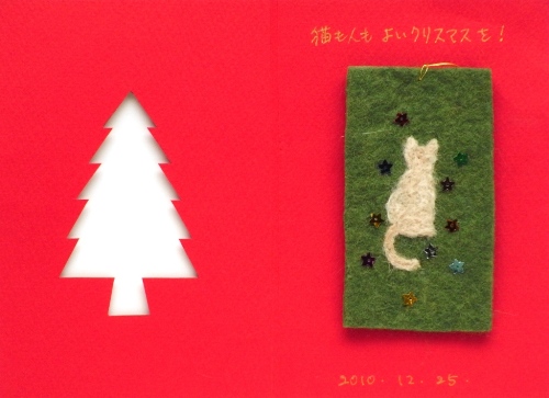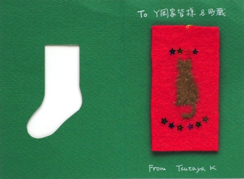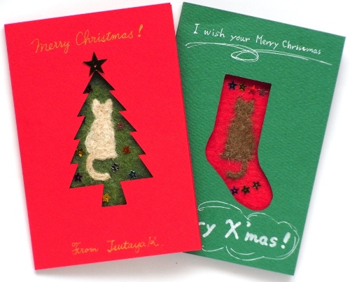ツリーや靴下の切り抜きから中の猫ちゃんが見えるようになっています。